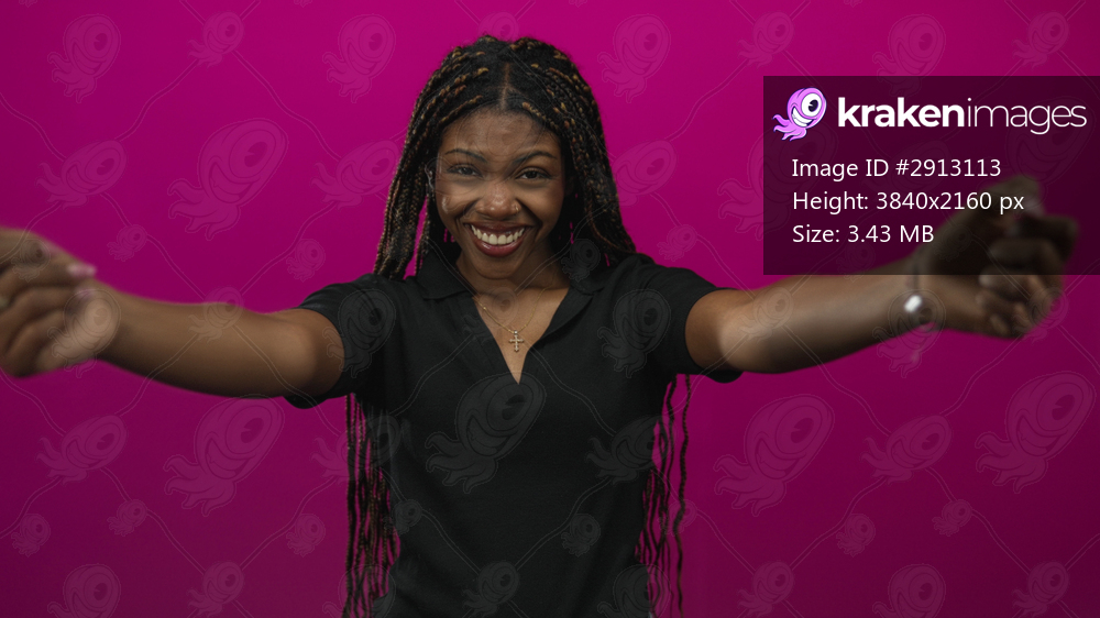 Woman with arms outstretched toward camera smiling wide, long braided hair, cross necklace and black polo top in magenta studio; joy welcome.