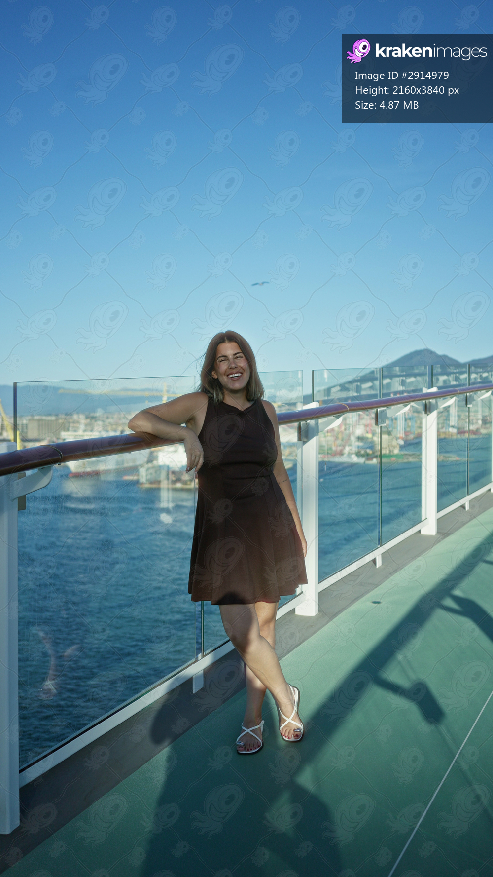 Woman with arms raised above head leaning on deck railing, smiling toward the sea; vacation joy.