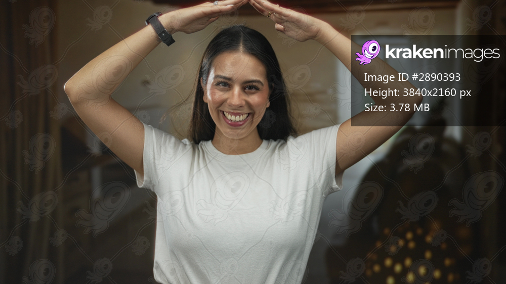 Woman with arms raised and hands above head in studio, smiling toward camera; joy confidence playfulness.