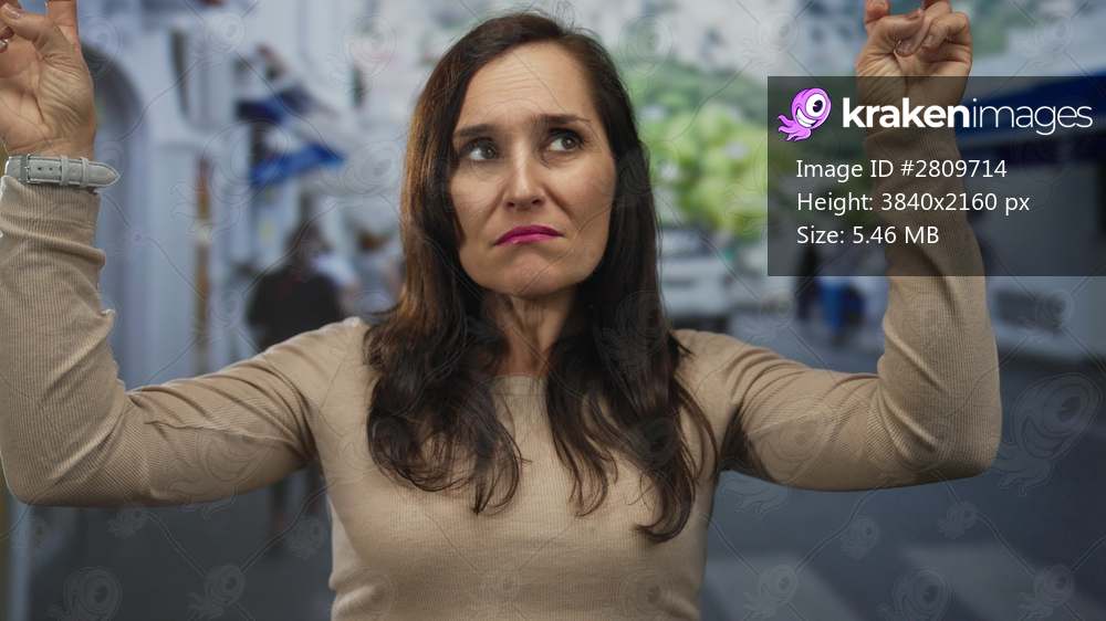 Woman with arms raised in confusion standing outdoors on a bustling street expressing frustration in an urban setting during daylight.