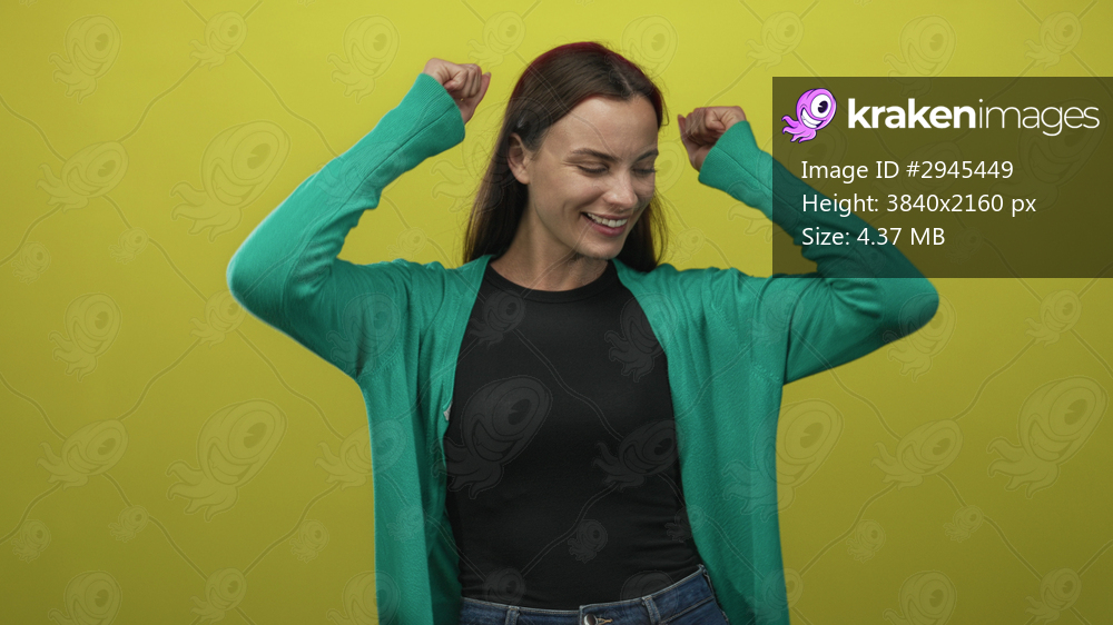 Woman arms raised in studio against yellow green wall wearing teal cardigan and black top; joyful energy.
