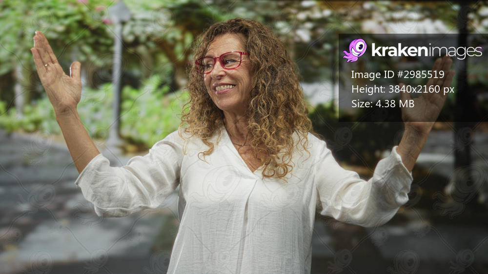 Woman with arms raised and open palms, smiling, red glasses and white blouse in park; joyful welcome.