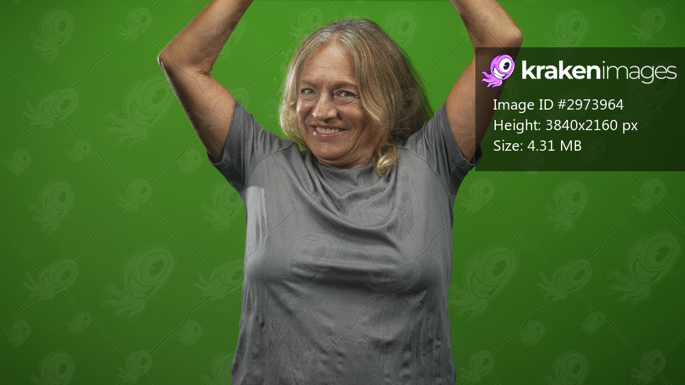 Woman with arms raised and smiling in studio green background, gray tshirt visible and expressive pose showing raised arms and laughter; joy celebration. - Kraken Images