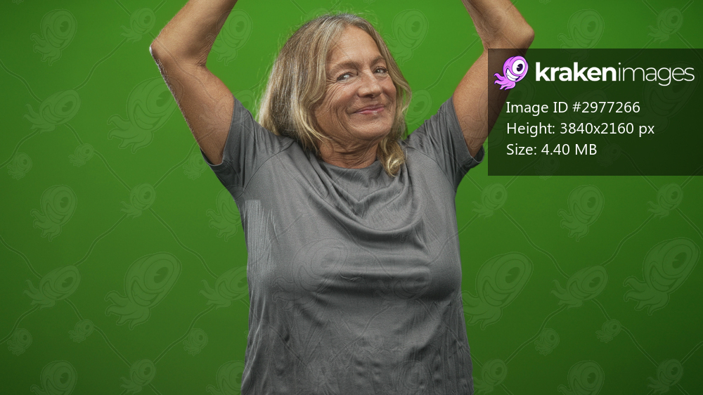 Woman with arms raised and smiling in studio green background, gray tshirt visible and expressive pose showing raised arms and laughter; joy celebration. - Kraken Images