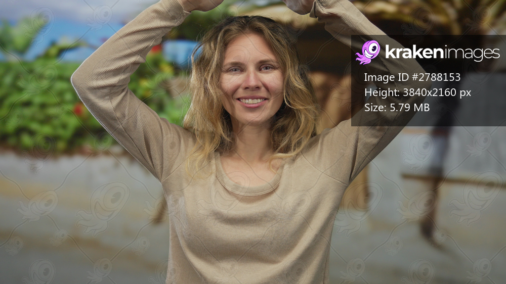 Woman with arms raising poses at a beach backdrop featuring a blonde young smiling subject highlighting hair in a portrait with casual style.