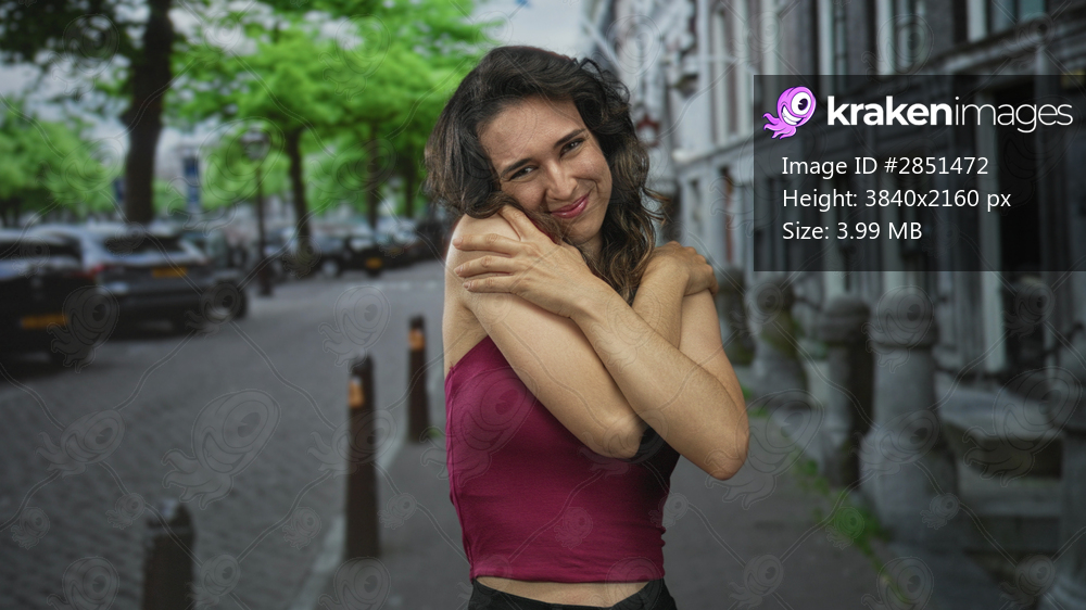 Woman arms reaching out in hugging gesture while smiling on city street with trees and parked cars; affection warmth connection closeness.