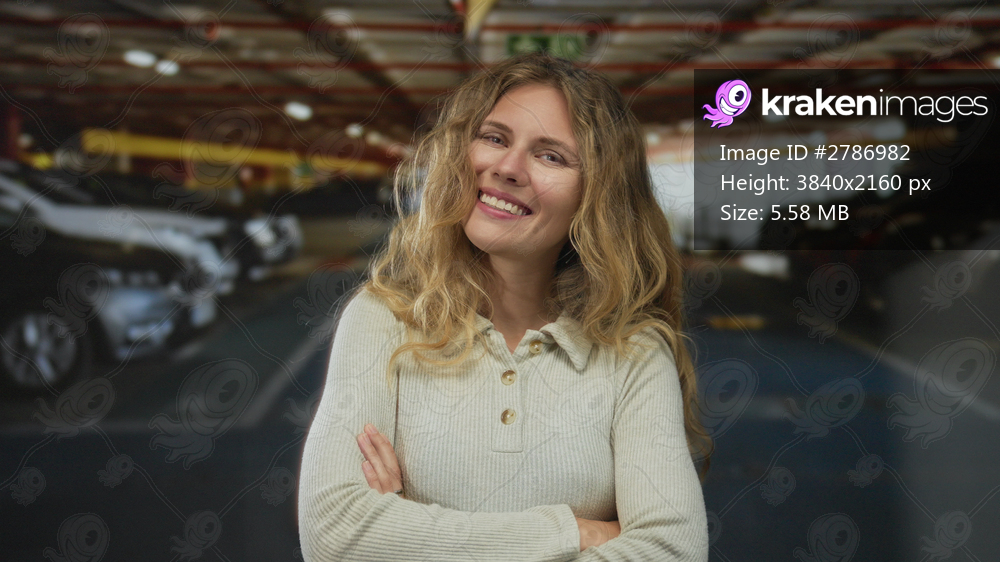 Woman arms smiling in garage reflect a blonde young spirit winking among crossed sweater sleeves for a casual portrait.