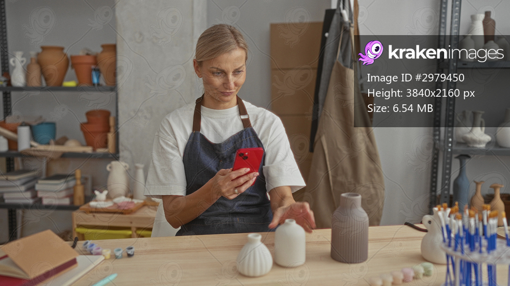 Woman artisan holds red smartphone in one hand and reaches with other hand to touch ceramic vase in studio; calm focus.