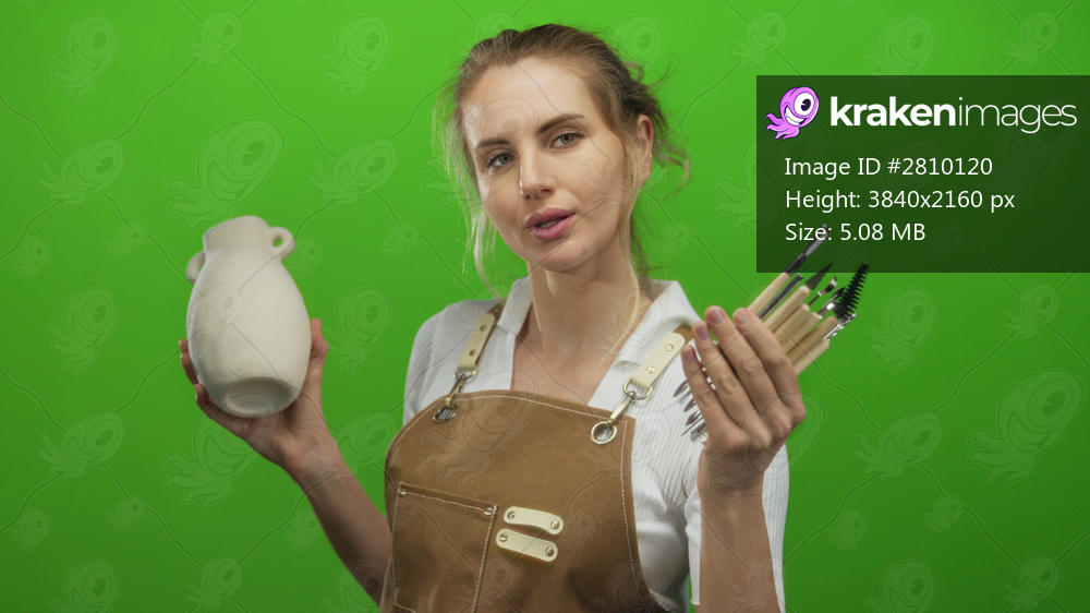 Woman artisan in apron holds a ceramic jar and paintbrushes, standing against a vibrant green background, showcasing creativity and craftsmanship.