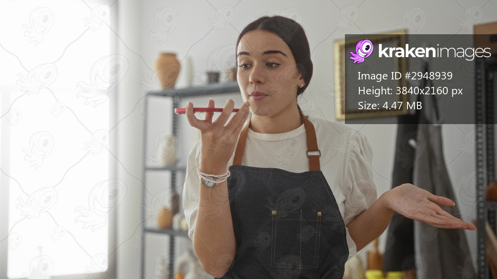 Woman artisan in denim apron holding smartphone to mouth for voice message, palm up questioning gesture among clay pots and shelves in pottery studio; thoughtful curiosity. - Kraken Images