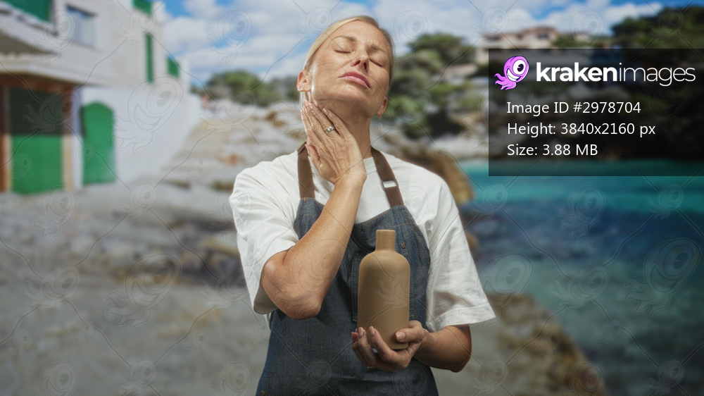 Woman artisan potter middleaged blonde wearing apron holding a ceramic bottle while touching her throat in studio; quiet satisfaction.