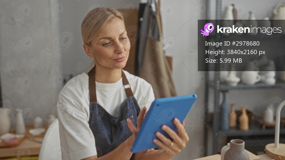 Woman artisan taps tablet with fingers in a pottery studio while wearing apron and smiling; contentment.