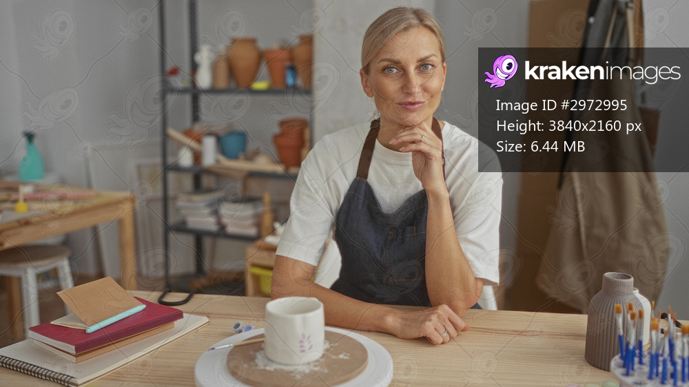 Woman artisan touches chin while smiling over a ceramic mug on a wheel at a pottery studio, seated at table with brushes and notebooks; creative contentment. - Kraken Images