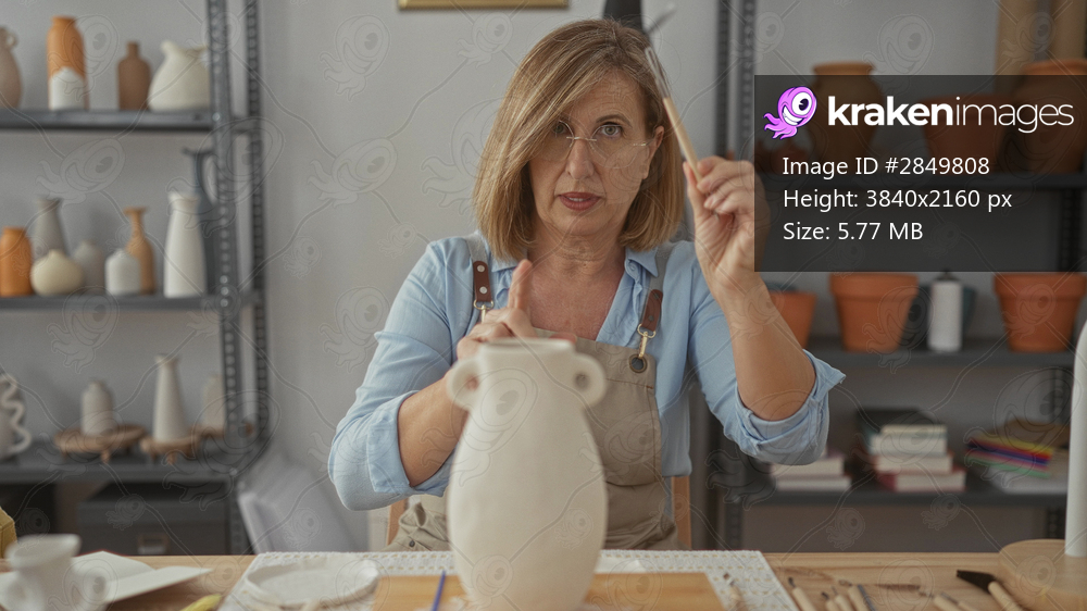 Woman artisan wearing apron points finger to unglazed vase on a wooden table in a bright studio with pottery shelves; creative concentration.