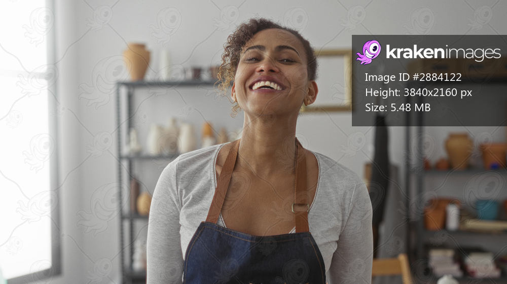 Woman artisan wearing denim apron smiling with visible teeth in studio with pottery shelves and clay tools on racks; creative joy.