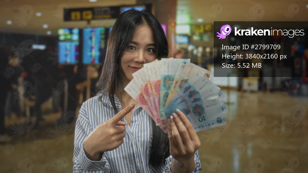 Woman at airport terminal holding chinese yuan banknotes indoors smiling pointing at camera vibrant background.