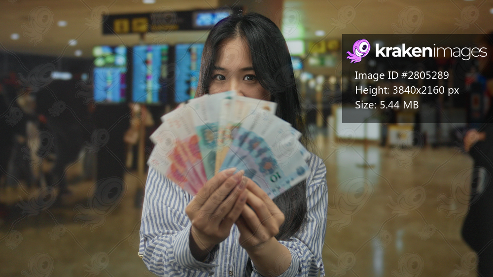 Woman at airport terminal holding chinese yuan banknotes indoors smiling pointing at camera vibrant background.