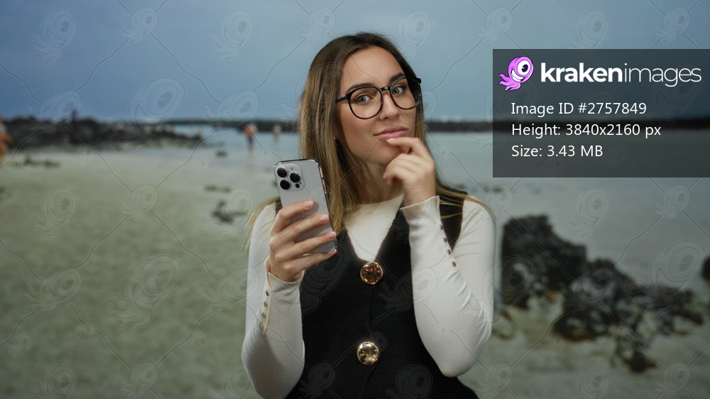 Woman at beach smiling with smartphone making idea gesture on a scenic seaside background exuding positive energy and innovative spirit, embodying youthful vibrancy. - Kraken Images