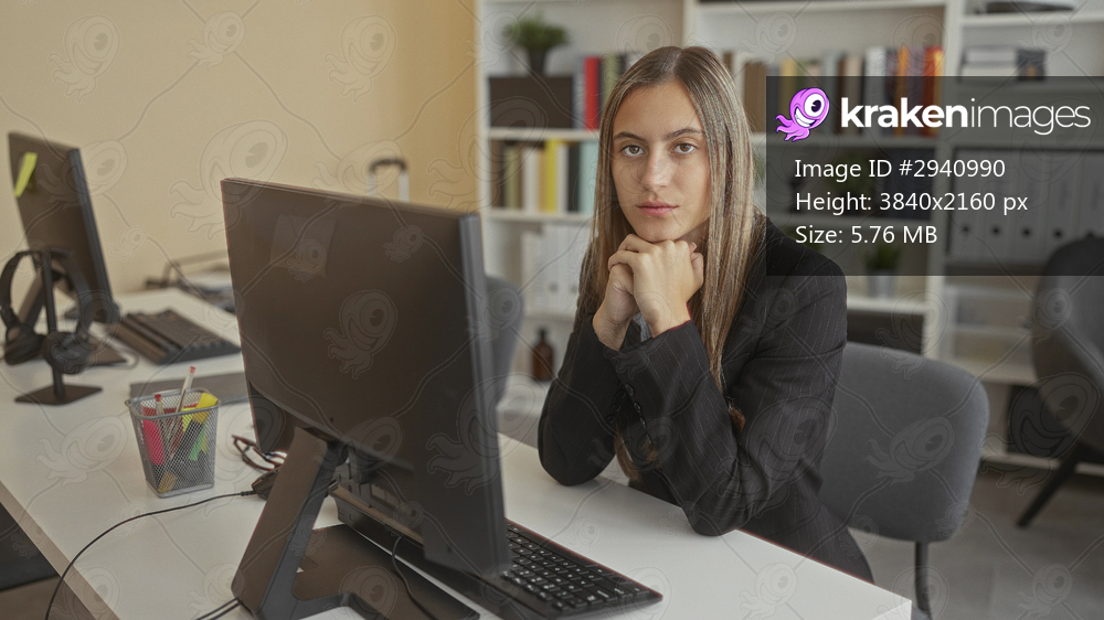 Woman at computer on white desk, hands clasped in pensive pose, looking at monitor in office; thoughtful focus.