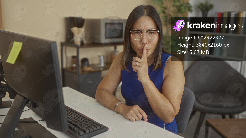 Woman at desk with finger to lips for silence, seated at keyboard and monitor in an office building; quiet concentration.