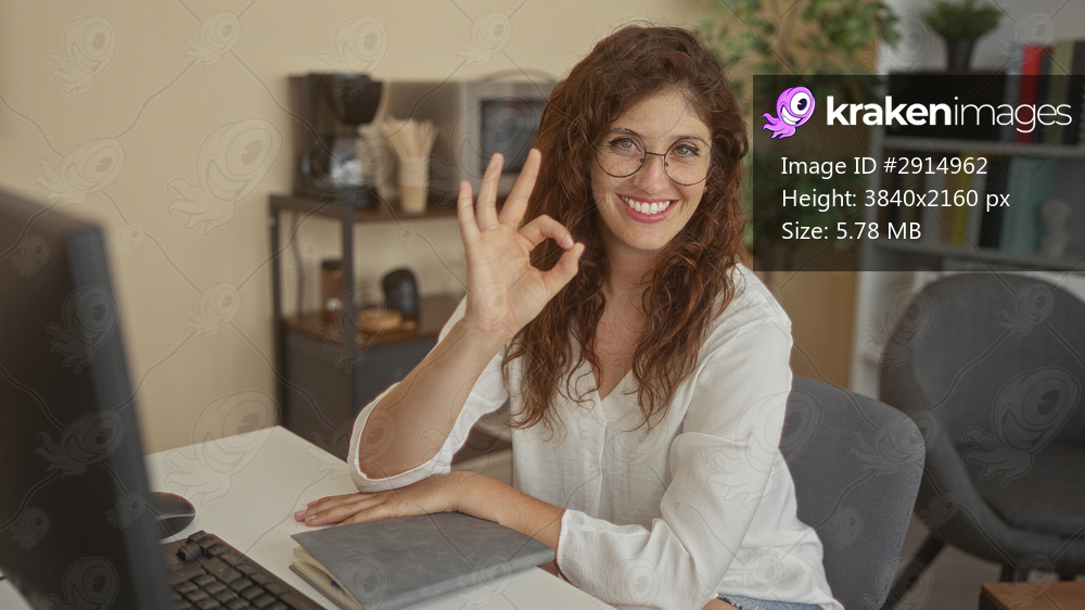 Woman at desk in building makes ok sign with hand beside computer and notebook while smiling; confidence productivity.