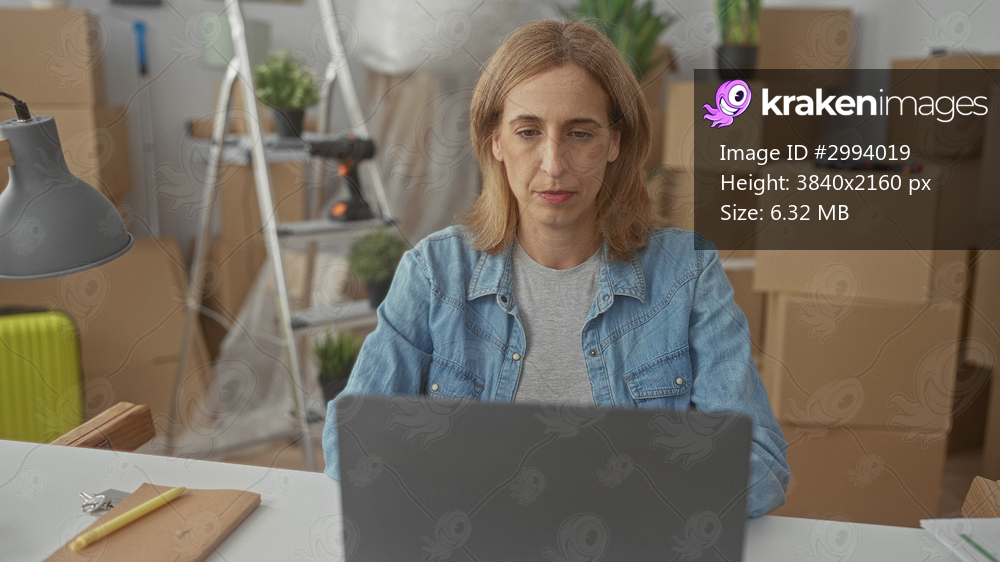 Woman at laptop with hand on cheek at table surrounded by cardboard boxes and ladder in a building; moving stress.