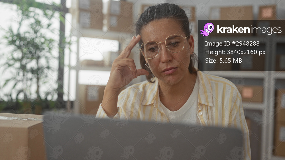 Woman at laptop with hand on temple, surrounded by cardboard boxes in a building; frustration small business.
