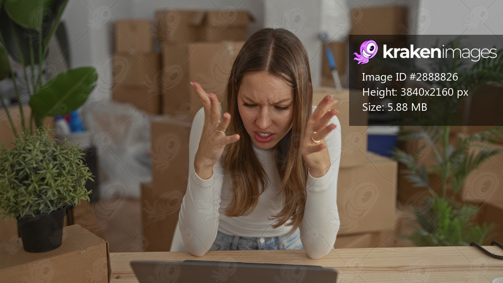 Woman at laptop with hands clasped to face in building surrounded by moving boxes and plants; moving day frustration.