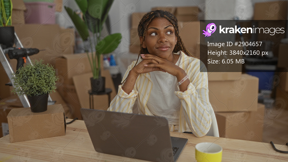 Woman at laptop with hands clasped under chin in house surrounded by moving boxes and plant; planning thinking hopeful.