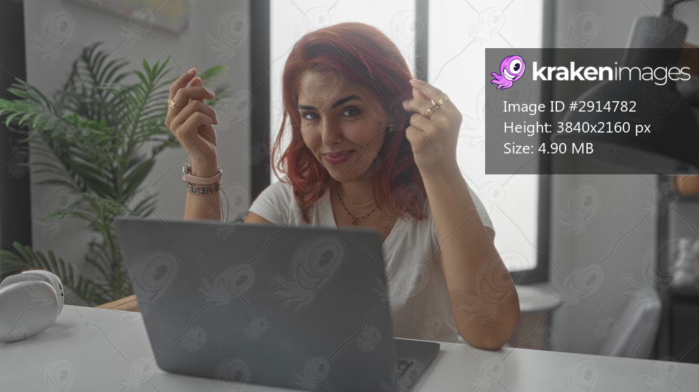 Woman at laptop touching hair and typing in studio at home desk, hands visible and wearing rings and necklace; focused productivity.