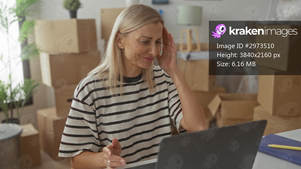 Woman at laptop typing and raising hand to head amid stacked cardboard moving boxes in a building packing area; frustration moving.