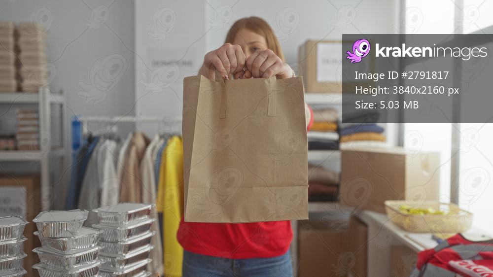 Woman at volunteer center organizing donations in an indoor room wearing a red shirt, focusing on charitable activities and community service.