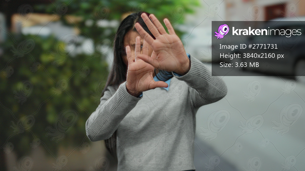 Woman avoiding camera with hands raised expresses discomfort on an urban street.