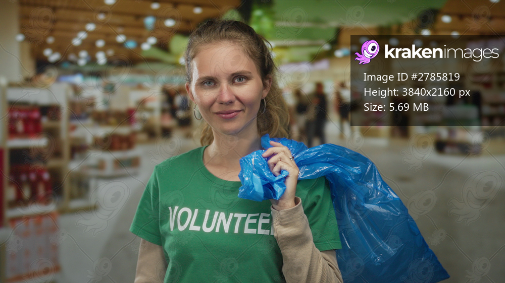 Woman with bag smiling inside a store during volunteer event featuring plastic blue shoulder gear for a blonde young participant.