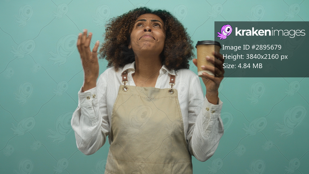 Woman baker holding a coffee cup and raising both hands while looking upward in teal studio; kitchen frustration.
