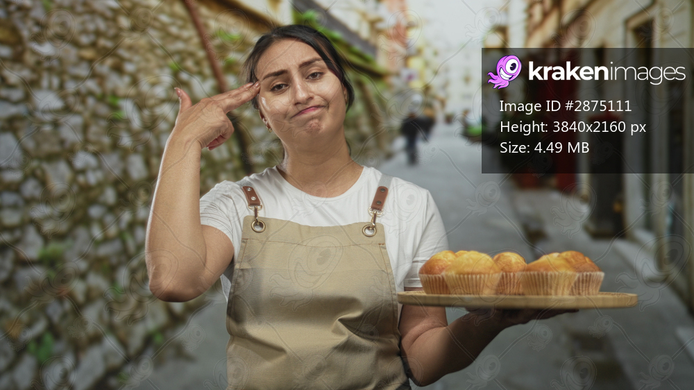 Woman baker holding a tray of muffins and points thumb to side on a street near a stone wall, wearing apron and offering pastries; quiet frustration.