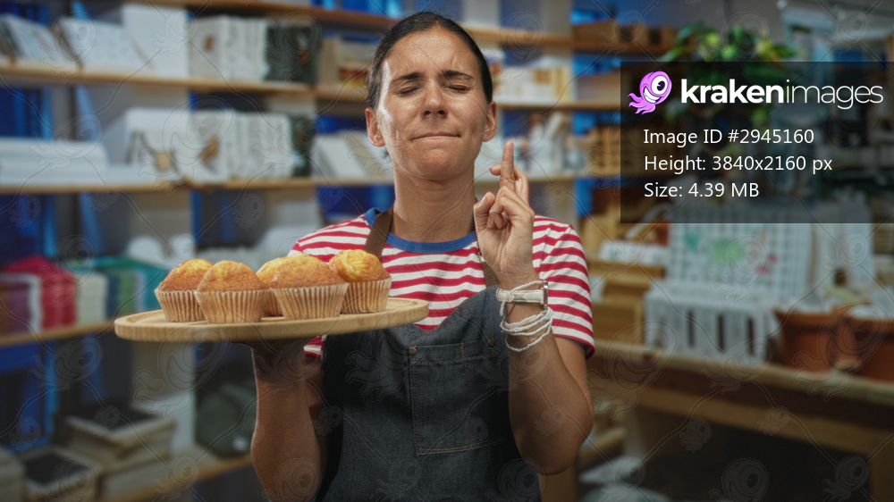 Woman baker holding wooden tray of muffins with fingers crossed while wearing apron in bakery shop; hope wish luck.
