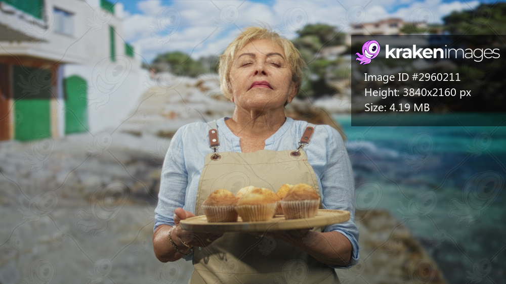 Woman baker holding wooden tray of muffins with hands, eyes closed, wearing apron in studio; serenity nostalgia warmth.