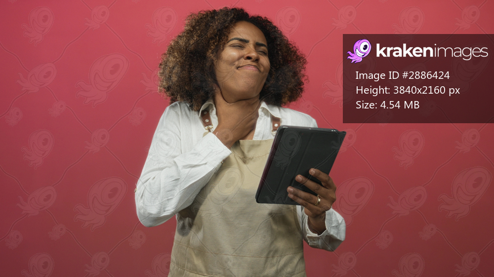 Woman baker in apron clutching neck and holding tablet in pink studio, eyes closed and face grimacing; pain stress.