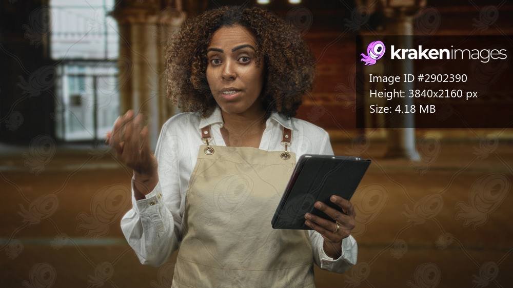 Woman baker in apron holding a tablet and shrugging with one hand raised in a historic building entrance, glancing at the screen; confusion.