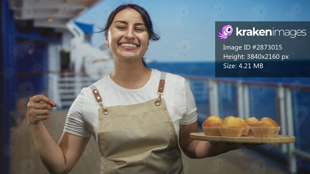 Woman baker in apron holding a wooden tray of muffins and pointing with one hand on a building deck near railings, smiling broadly; friendly service joy. - Kraken Images