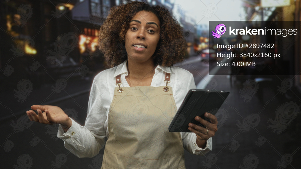 Woman baker in apron holds tablet and gestures with open hand on a busy city street at dusk; confidence hospitality.