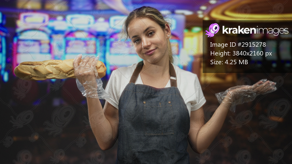 Woman baker in denim apron holds long baguette in one gloved hand and shrugs with visible face and slight smile beside row of slot machines in casino building; quirky bemused. - Kraken Images