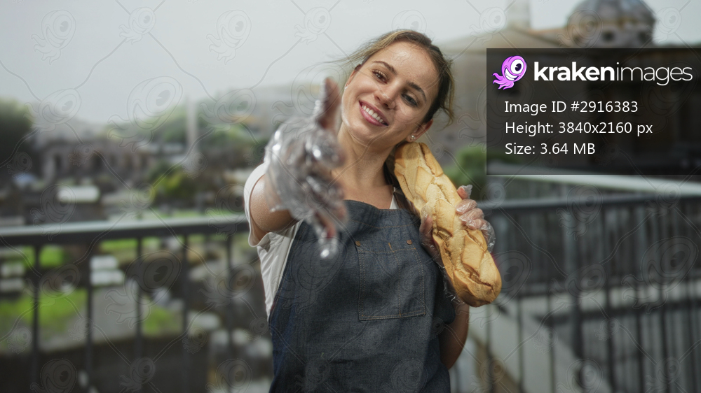 Woman baker offering baguette and reaching hand forward on ancient ruins balcony building; hospitality joy.