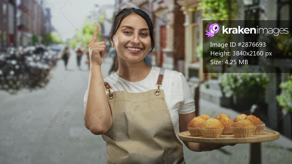 Woman baker points finger to temple holding a tray of muffins while wearing an apron on street; cheerful service.