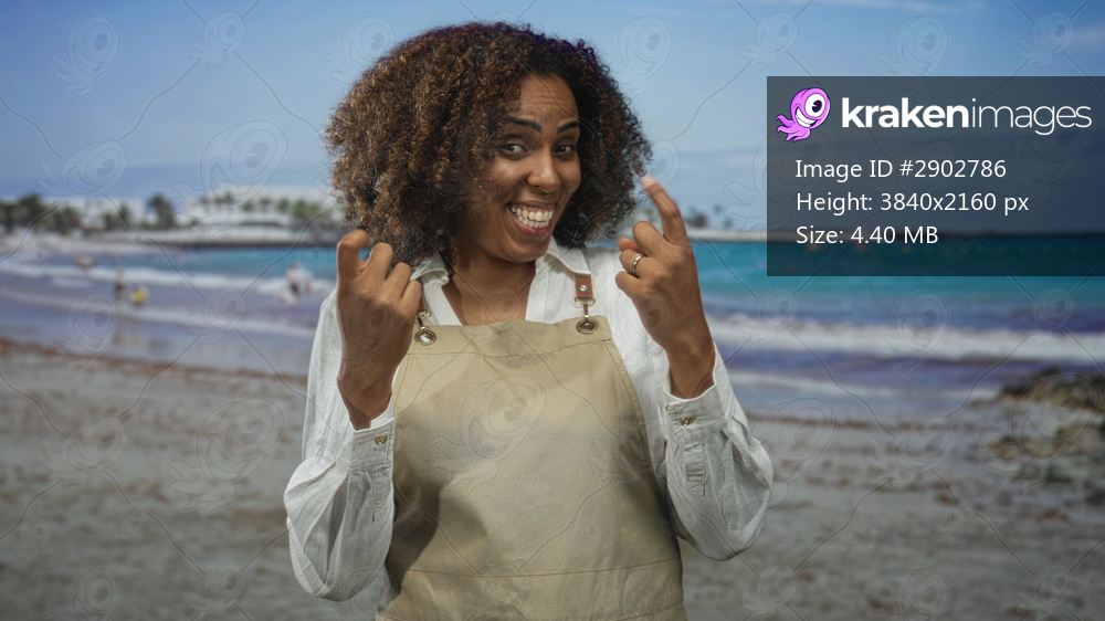 Woman baker wearing apron clenches fists in studio with beach scene visible along the shore; joy triumph.