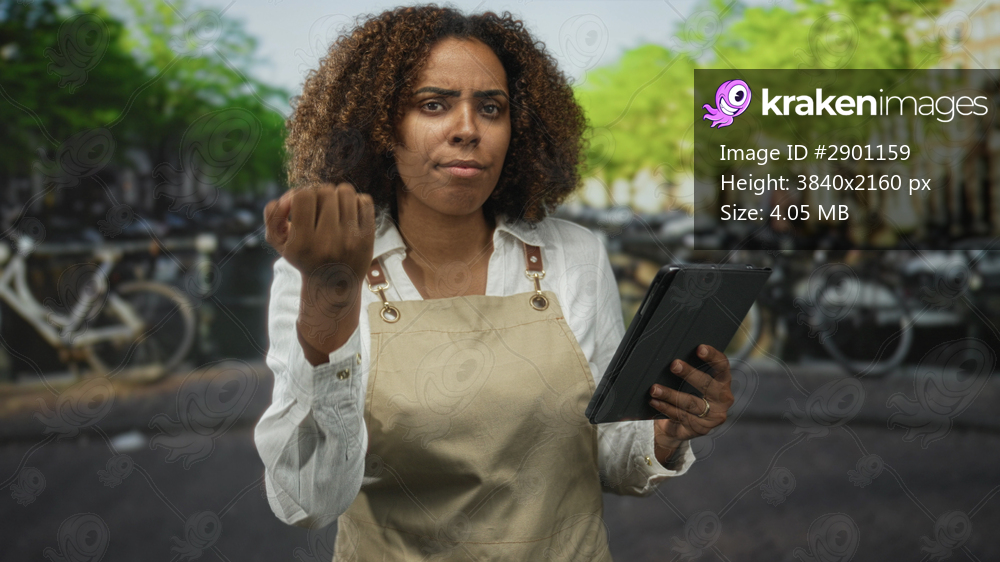 Woman baker wearing apron holding tablet and clenching fist on street in amsterdam; frustration determination.