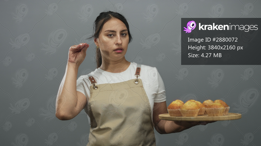 Woman baker wearing apron holding wooden tray of muffins with one hand and making a small pinching gesture in gray studio; boredom.