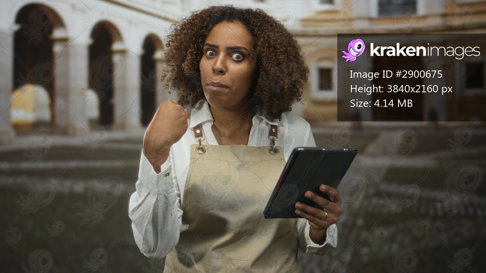 Woman baker wearing apron holds tablet and gestures with hand in old town building courtyard, eyes wide in questioning expression; frustration small business. - Kraken Images
