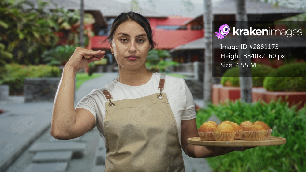 Woman baker wearing apron holds tray of muffins with one hand and rolls eyes while standing by hotel building pathway; frustration.
